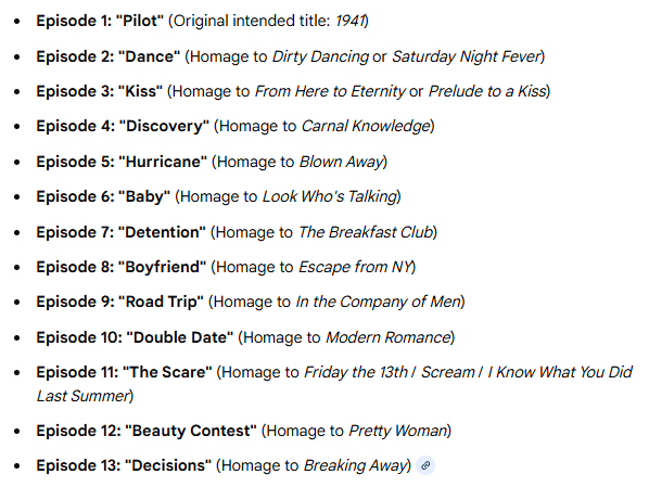 3/ Homenaje en los títulos (perdido): Qué chulos eran los títulos de los episodios de la primera temporada, que homenajeaban el argumento, o partes del mismo, de películas (comerciales americanas, mayormente). No sé si por motivos legales tuvieron que renombrarlos, pero a día de hoy tenemos un nombre doble para cada capítulo del primer año de DC. A partir de la segunda ya se pusieron a titularlos como buenamente creyeran, y yo siempre eché en falta más guiños peliculeros (ocasionalmente los hay, ¿eh?, no es que abandonaran totalmente la costumbre, y en la quinta temporada hay un repunte de lo más curioso en este sentido pero con guiños a obras clásicas de la literatura -la serie ya era Joey’s Creek y la chica estaba empezando la uni y sus intensas clases con Ken Marino -que luego descubrí que era un actor de comedia y el de Dawson Crece era de sus pocos papeles serios, qué cosas-). Os dejo debajo la relación de títulos de esa primera temporada y la peli que homenajeaban:
