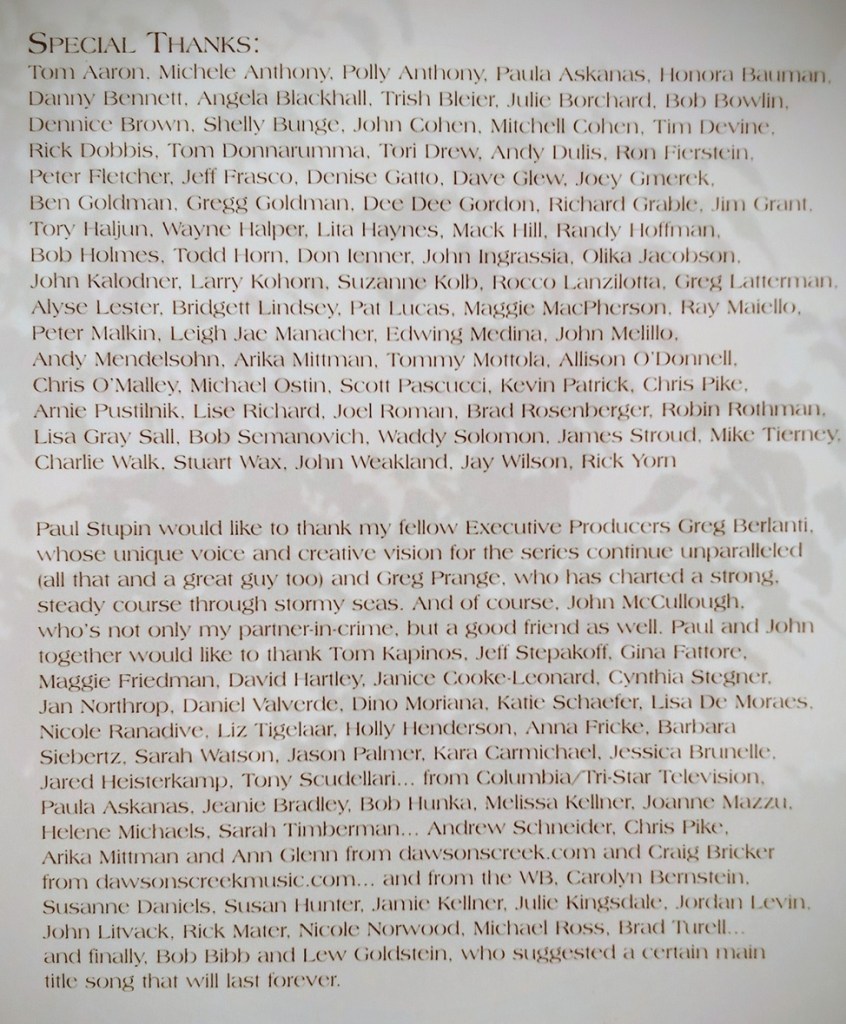 Una pena, o una oportunidad perdida, o llámalo X (pero no la de Elon), que no metieran en ninguno de los CD’s la canción Run like mad de Jann Arden, que fue la canción de los créditos de la primera temporada de la serie en España y que es LA CANCIÓN DE DAWSON en mi cabeza tanto como lo es la de Paula Cole.