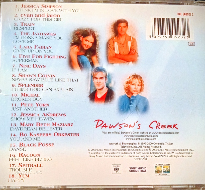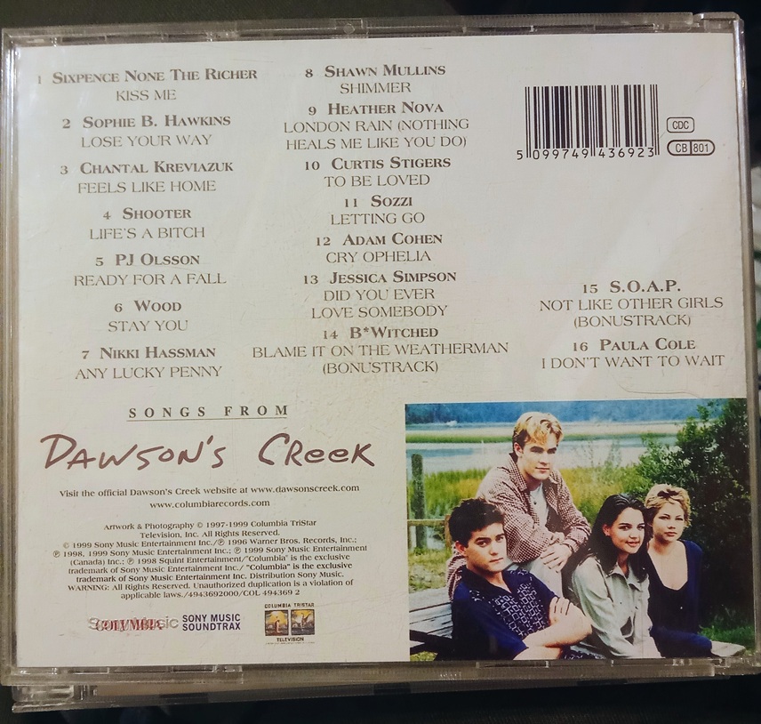 Hace poco encontré mi CD con las canciones de Dawson Crece– – – perdón, quería decir MIS DOS CD’s con las canciones de Dawson Crece, porque la serie lo petó tanto que se sacaron de la manga dos recopilatorios con canciones que sonaban (y con canciones que NO sonaban) en los episodios de sus tres primeras temporadas: Songs From Dawson’s Creek Volume 1 y Songs From Dawson’s Creek Volume 2 (duh! Si lo hubieran llamado “Songs from Felicity” hubiese sido raro -¡el CD de Felicity también lo tengo porque soy absolutamente girlie, sí lo digo!-).